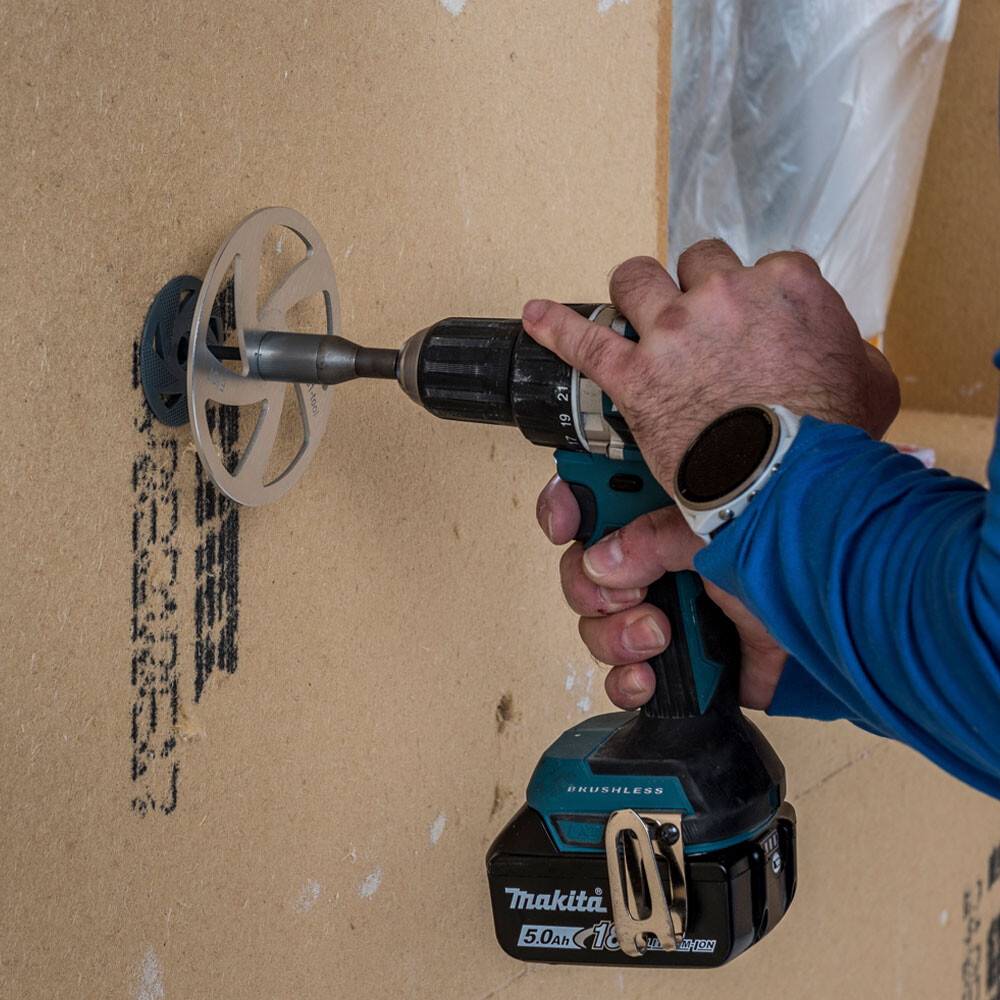 Sehr einfach und besonders schnell geht das Einschrauben des Thermotop Schraubdübels S1 short mit dem Thermotop Setzwerkzeug S1. Die Schraube wird so weit eingedreht, bis die Scheibe des Setzwerkzeugs auf der Dämmplattenoberfläche aufliegt. Danach klingt sich der Bit selbständig aus und der Dübel ist oberflächenbündig gesetzt.
