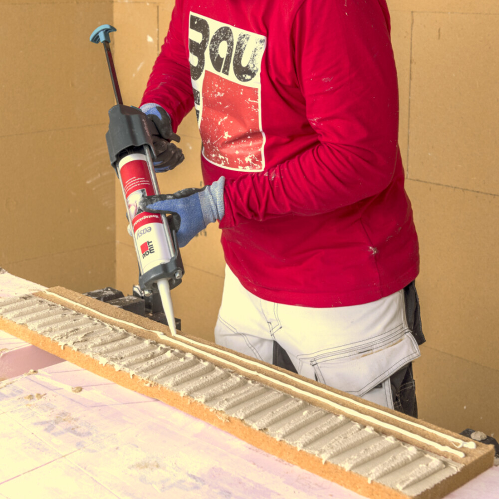 Mit dem Montagekleber ist im Stoßbereich eine gute Eckverklebung sichergestellt und minimiert ein Risiko von möglichen Wärmebrücken.
