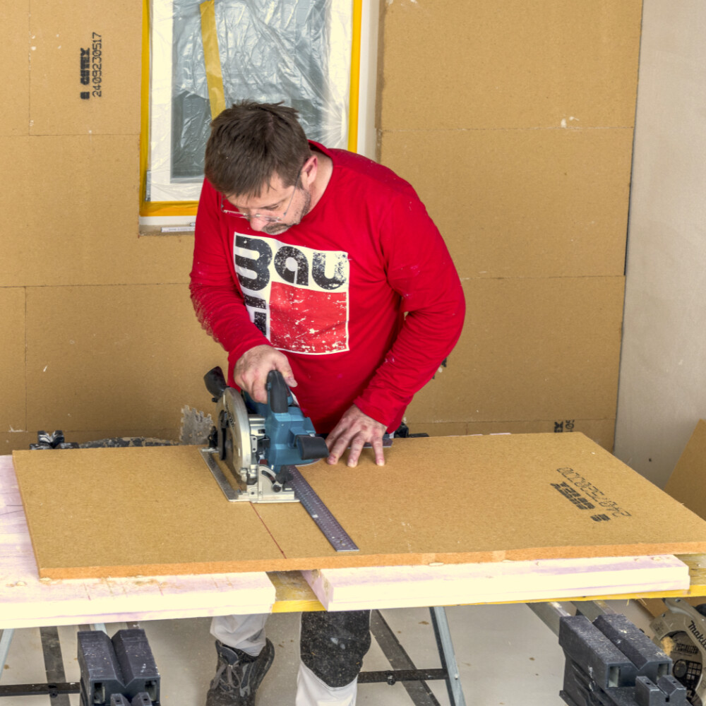 Zum Zuschneiden der Laibungsplatte empfehlen wir dir eine Handkreissäge. Alternativ kannst du aber auch eine Stichsäge oder eine Handsäge verwenden.