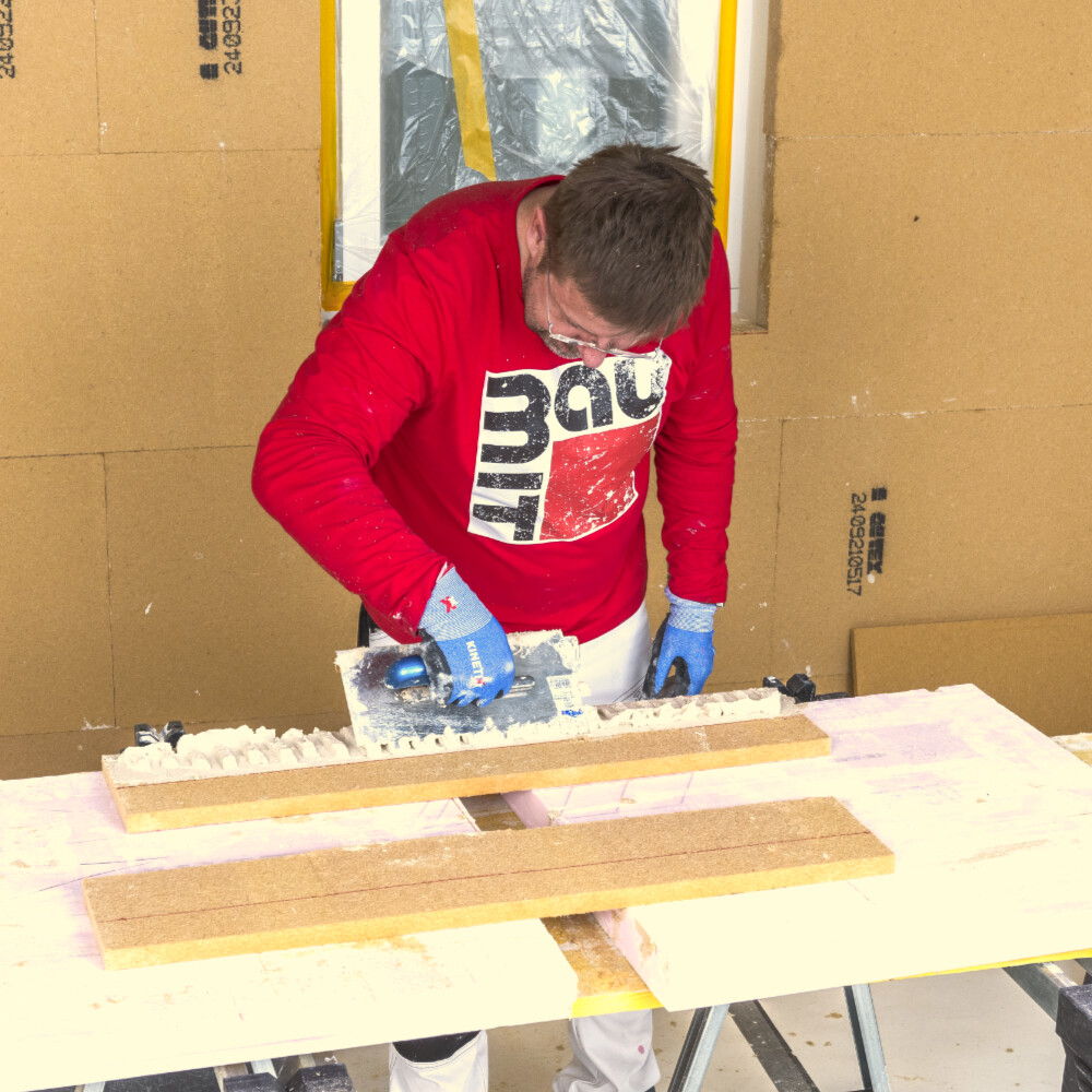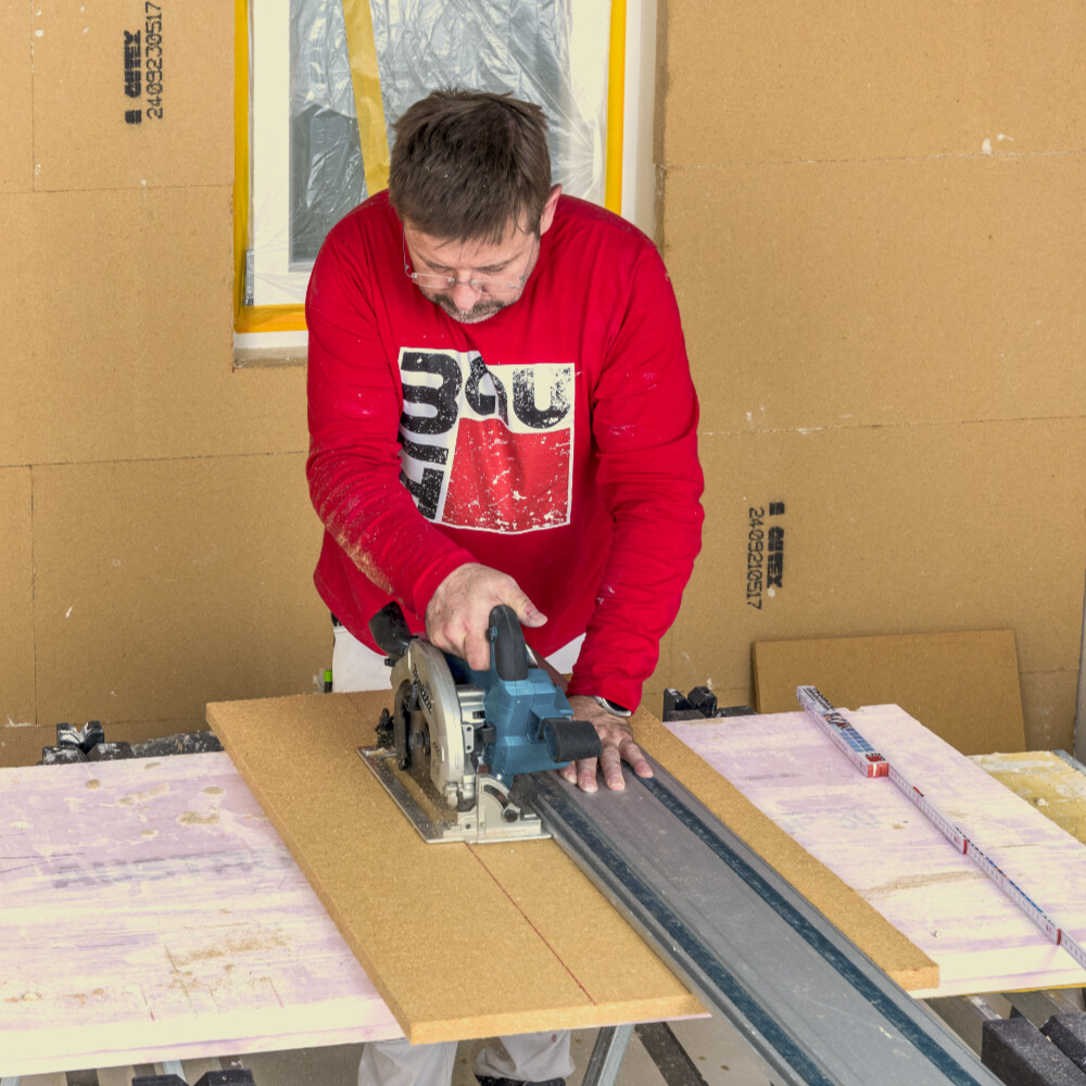 Für einen fugenfreien Einbau der Laibungsplatte sind gerade Schnitte sehr wichtig. Aus diesem Grund empfehlen wir dir besonders bei der Ausführung von längeren Schnitten den Einsatz einer Führungsschiene für die Handkreissäge.