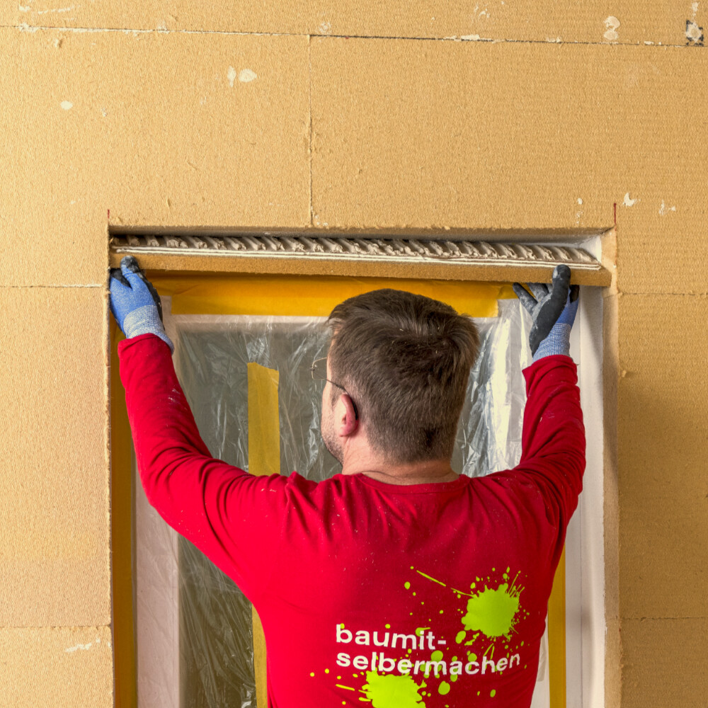 Der Übergang Laibungsplatte zur Wand-Dämmplatte muss frei von Klebemörtel bleiben. Markiere diesen Bereich und trage anschließend den frisch angemischten Klebemörtel nur in dem Bereich auf, der später in der Laibung auf das Mauerwerk bzw. den Putz geklebt wird.
