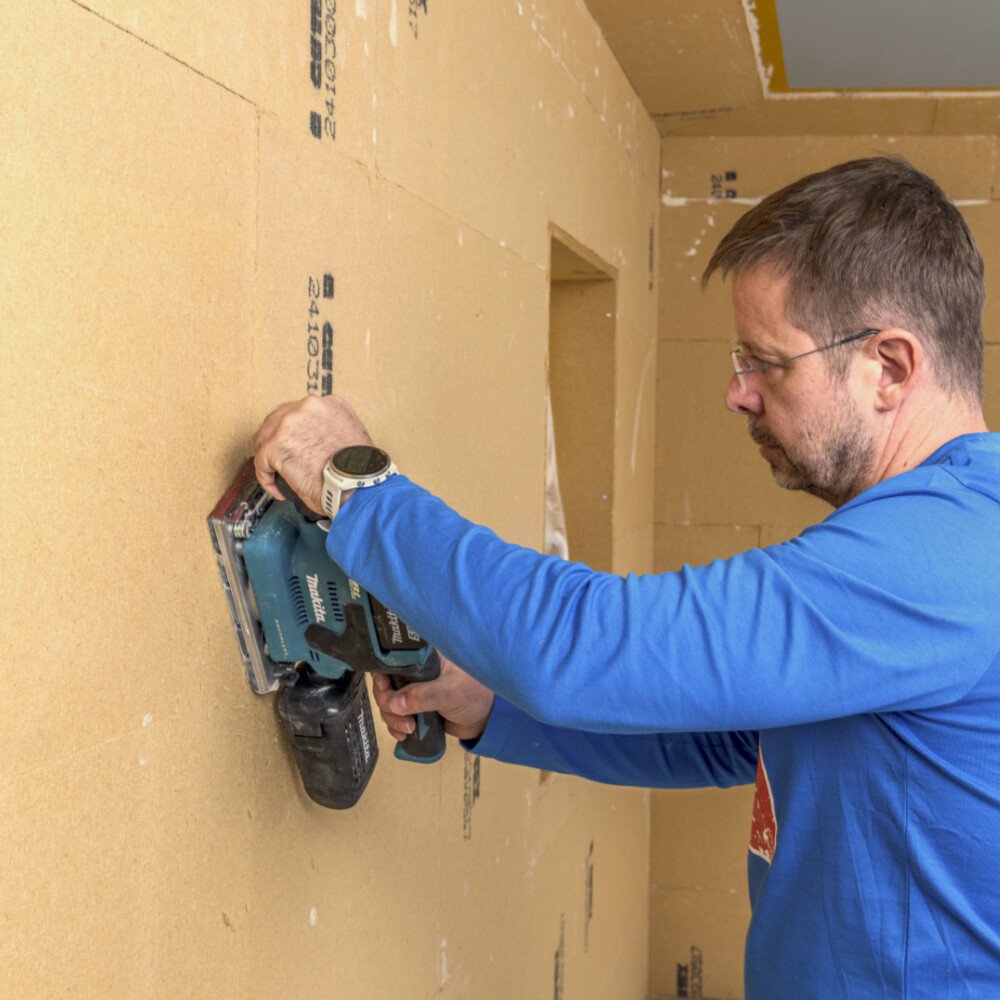 Schleife den Höhenversatz beispielsweise mit einem Exzenter- oder Schwingschleifer oberflächenbündig ab. Wir empfehlen eine Schleifpapier mit 80 bis120 Körnung.