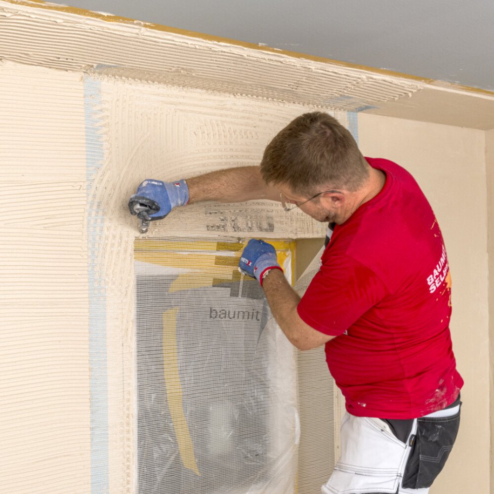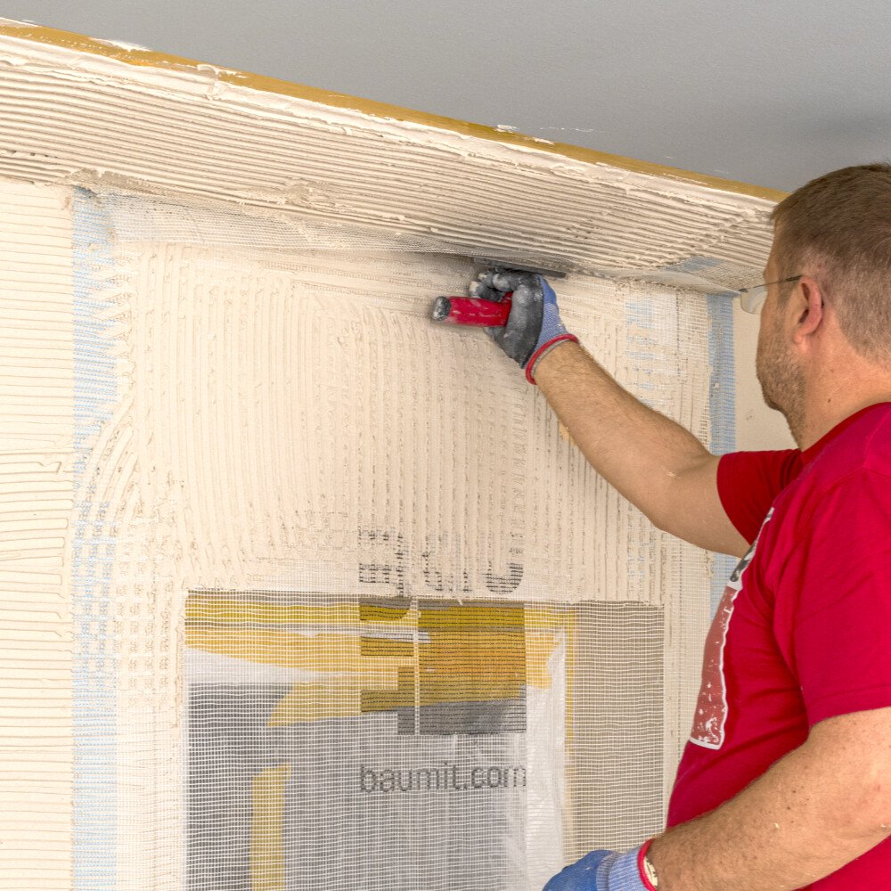 Ziehe die frische Armierungsspachtel mit einem Flächenspachtel möglichst eben ab. Das Baumit-Armierungsgewebe soll vollständig in der Spachtelmasse eingebettet und nach Abschluss der Arbeiten nicht mehr sichtbar sein.