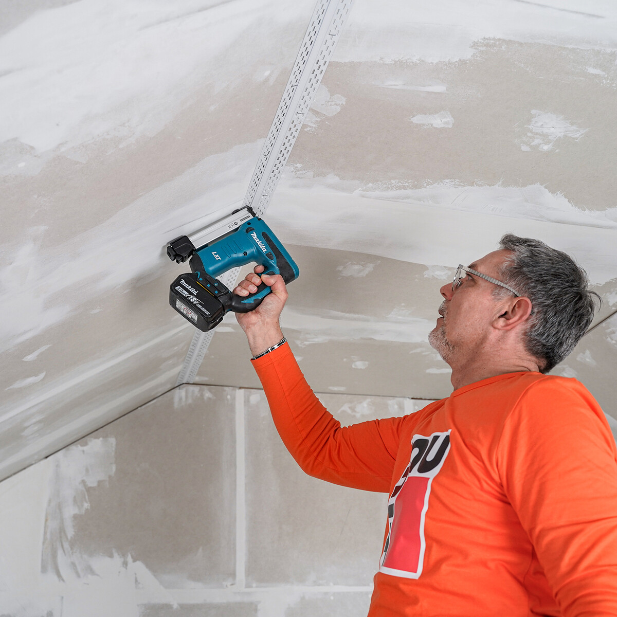 Drücke das Profil anschließend fest gegen die zweite Trockenbaufläche, sodass es dort bündig und spannungsfrei anliegt. Tacker nun auch diese Seite fest.