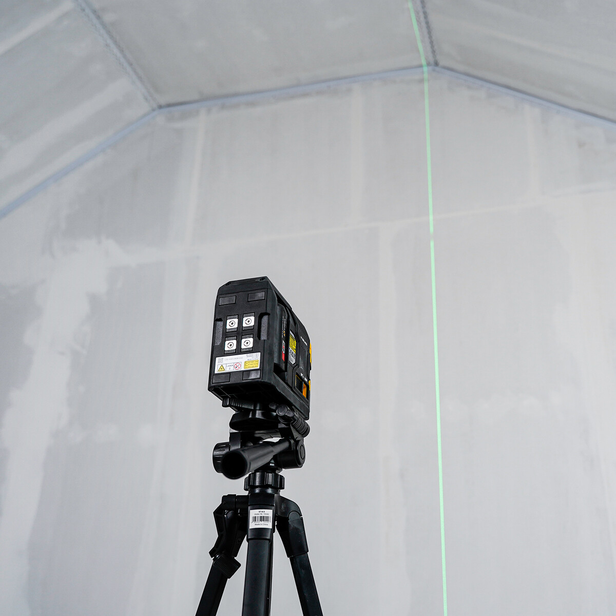 Stelle nun den Kreuzlaser auf ein Stativ und richte den Laserstrahl auf die beiden zuvor gesetzten Markierungen aus. So entsteht eine exakte Fluchtlinie, an der du das Profil später ausrichten kannst.