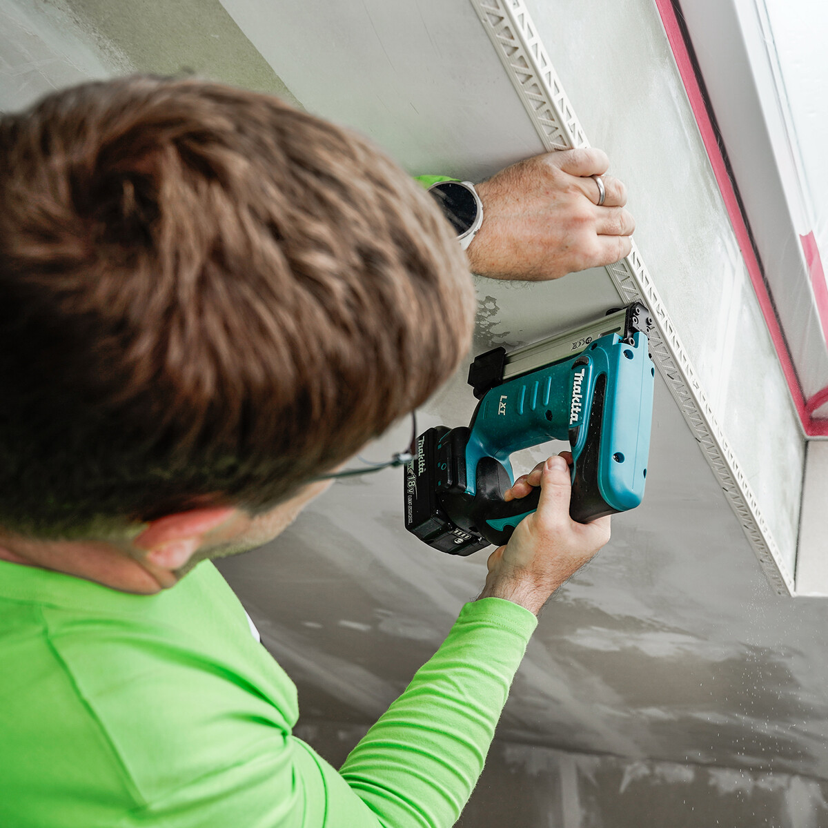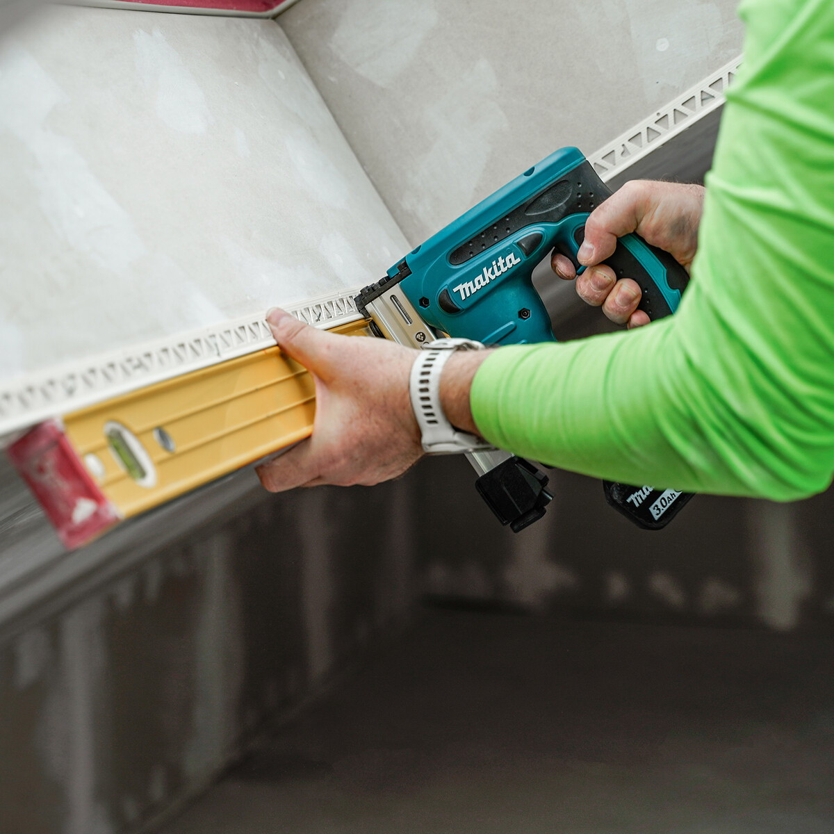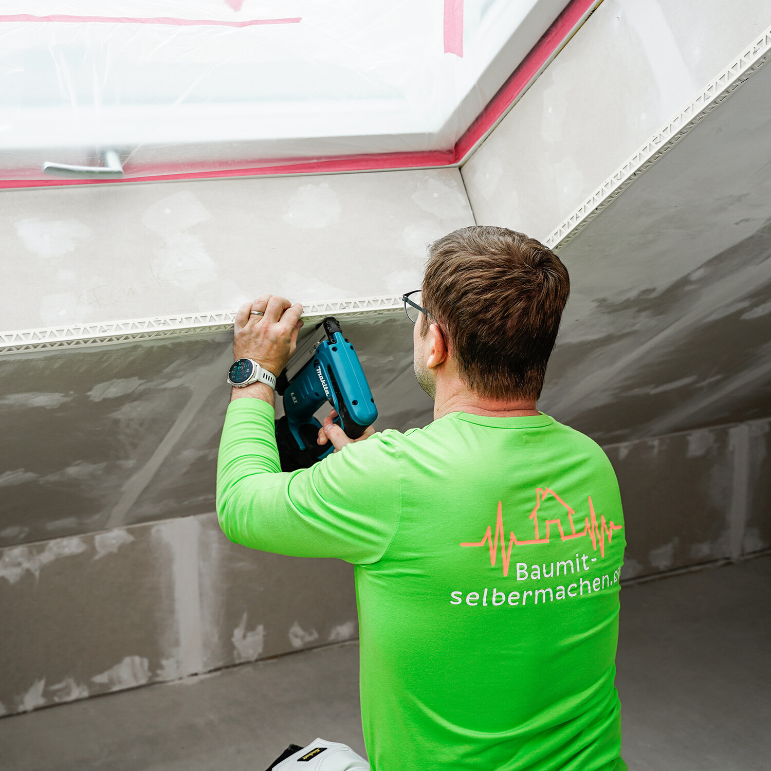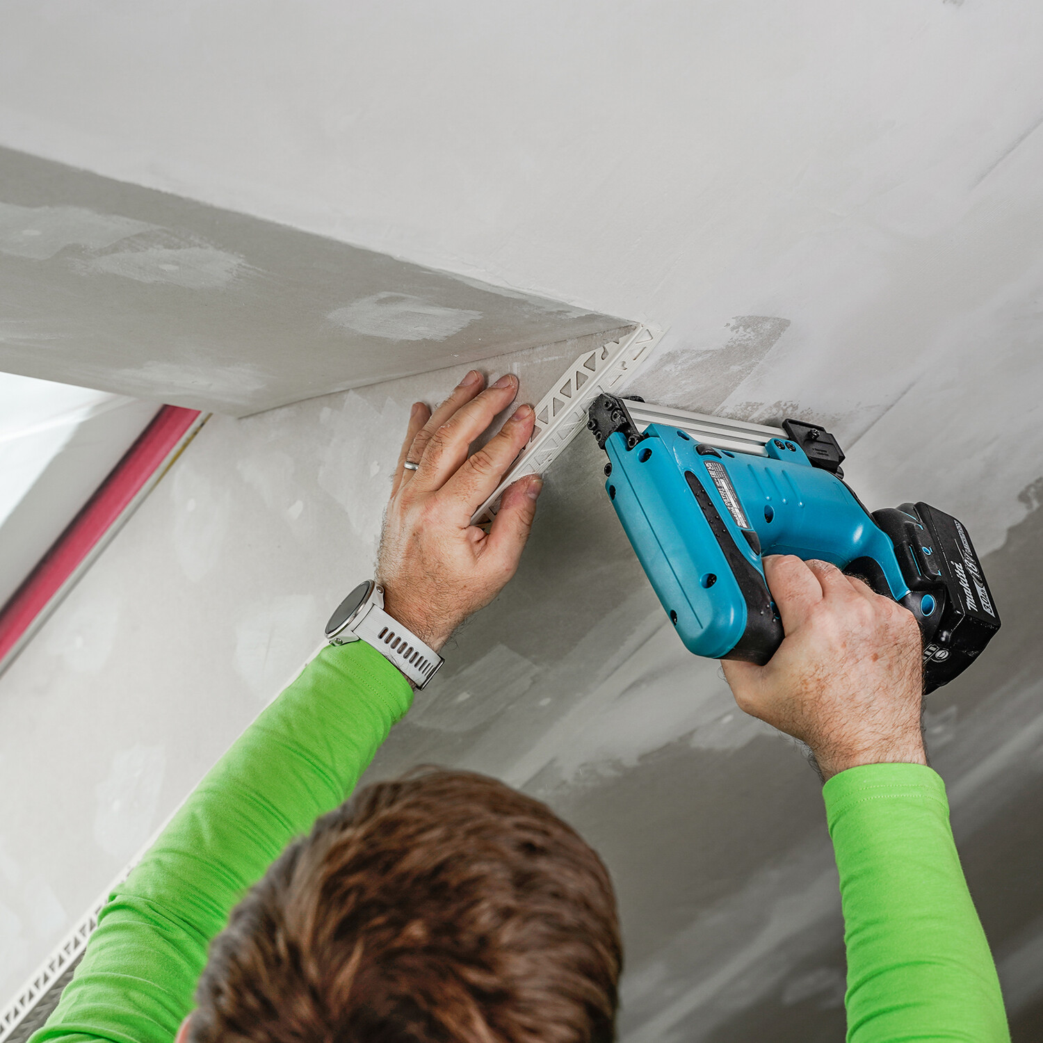 Wenn alles passt, tackerst du zunächst die erste Seite des Profils an der Trockenbauplatte fest. Achte darauf, dass das Profil bündig und gerade aufliegt.