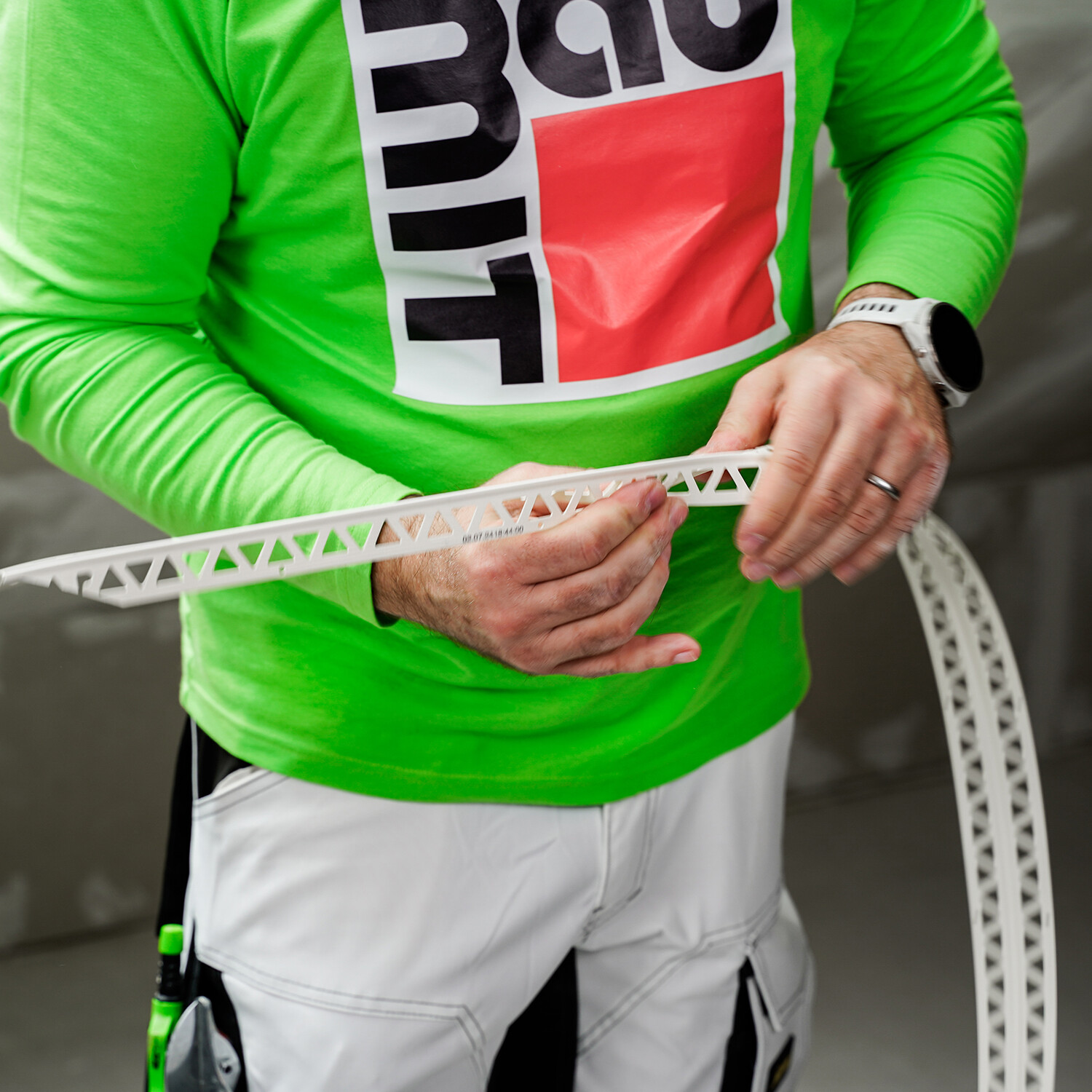Das Protektor 3751 wird als Rollenware geliefert. Nach dem Zuschneiden solltest du das Profil einmal mittig vorknicken. Das erleichtert dir das spätere Setzen an der Kante und sorgt dafür, dass es sich besser an die Form der Ecke anschmiegt.