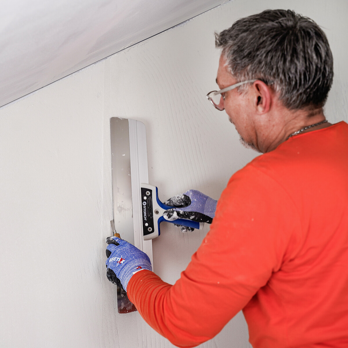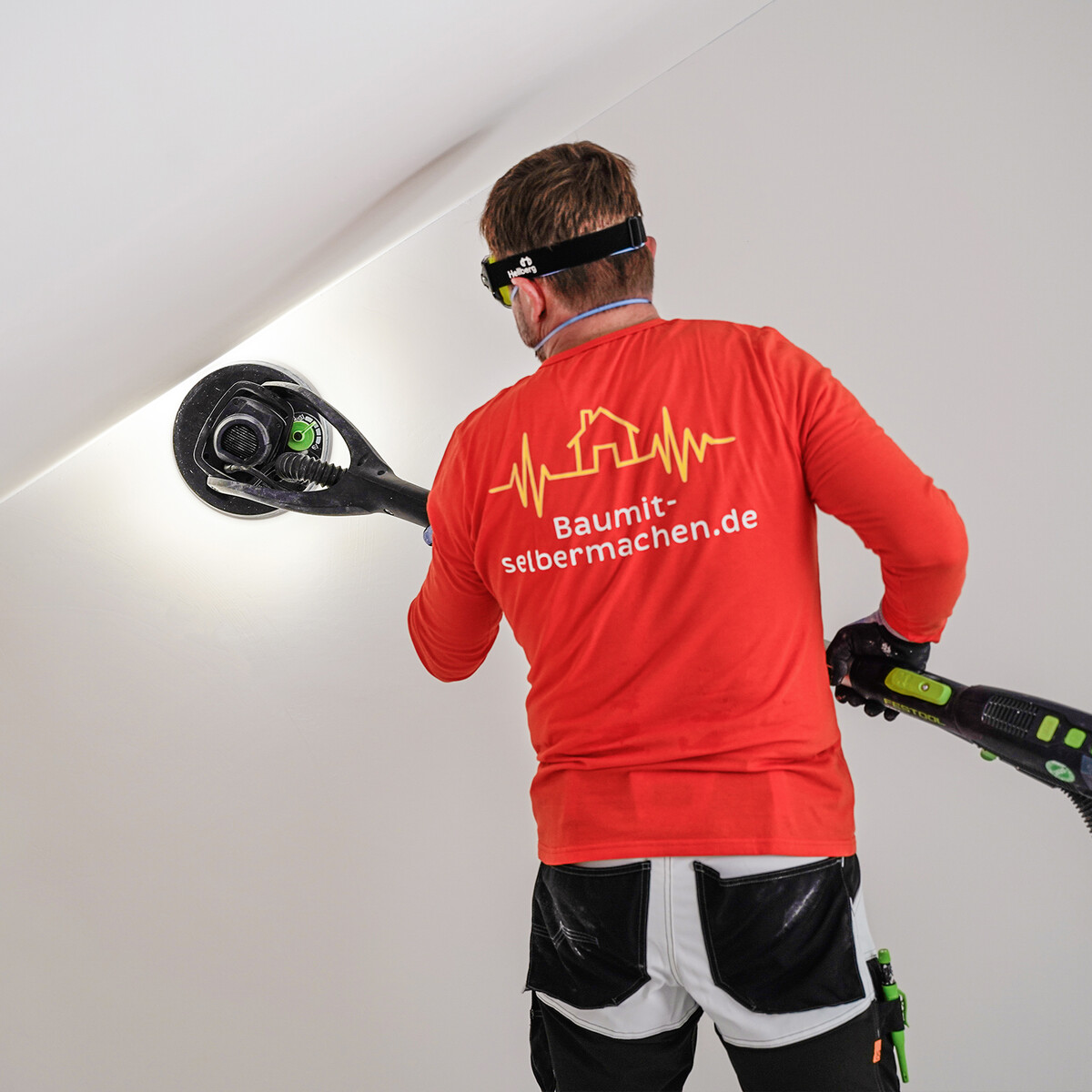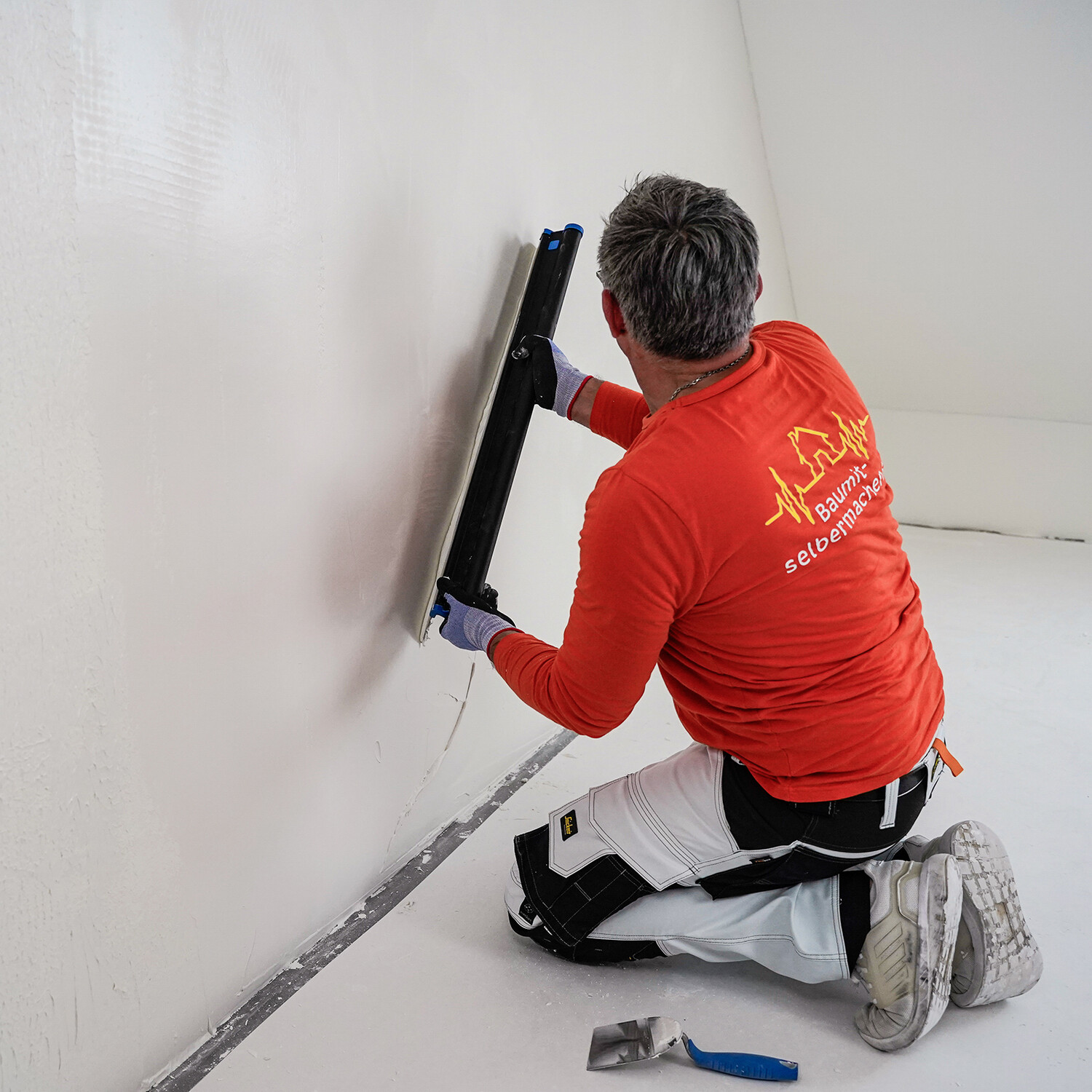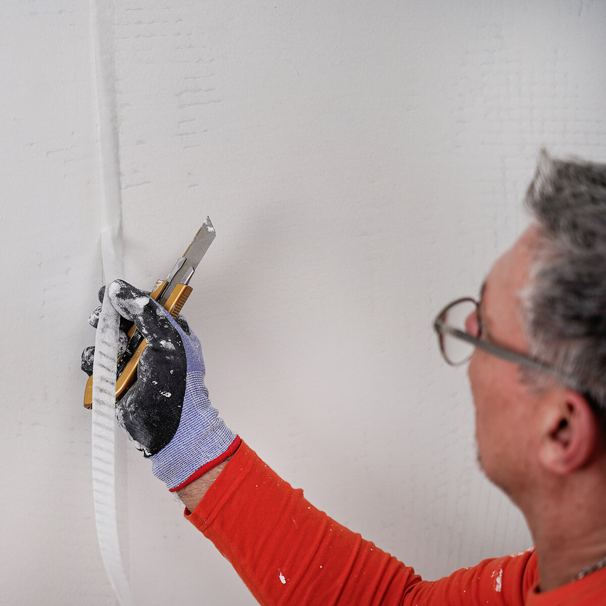 Voraussetzung dafür ist eine fachgerecht montierte Unterkonstruktion sowie eine korrekt ausgeführte Beplankung mit Gipskarton- oder Gipsfaserplatten. Auch die Fugenspachtelung muss bereits abgeschlossen sein. Für ein gutes Ergebnis empfehlen wir, die gespachtelten Fugenflächen vorab oberflächenbündig zu schleifen (Qualitätsstufe Q2).