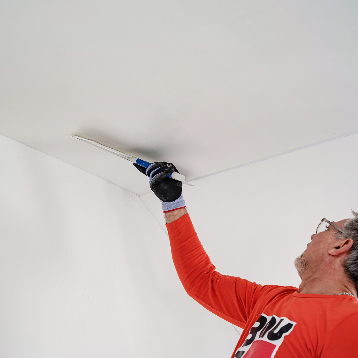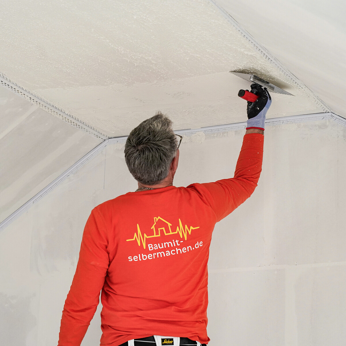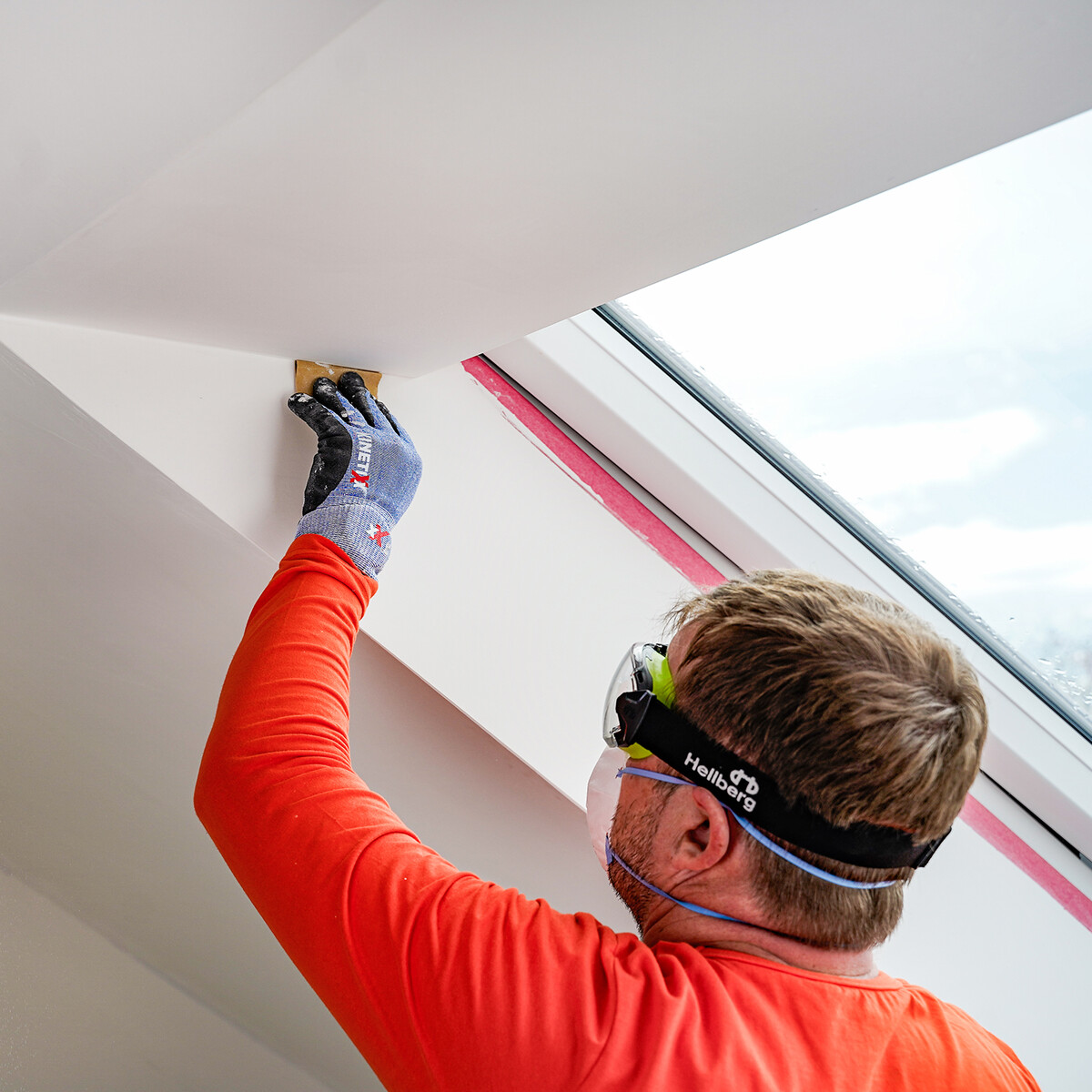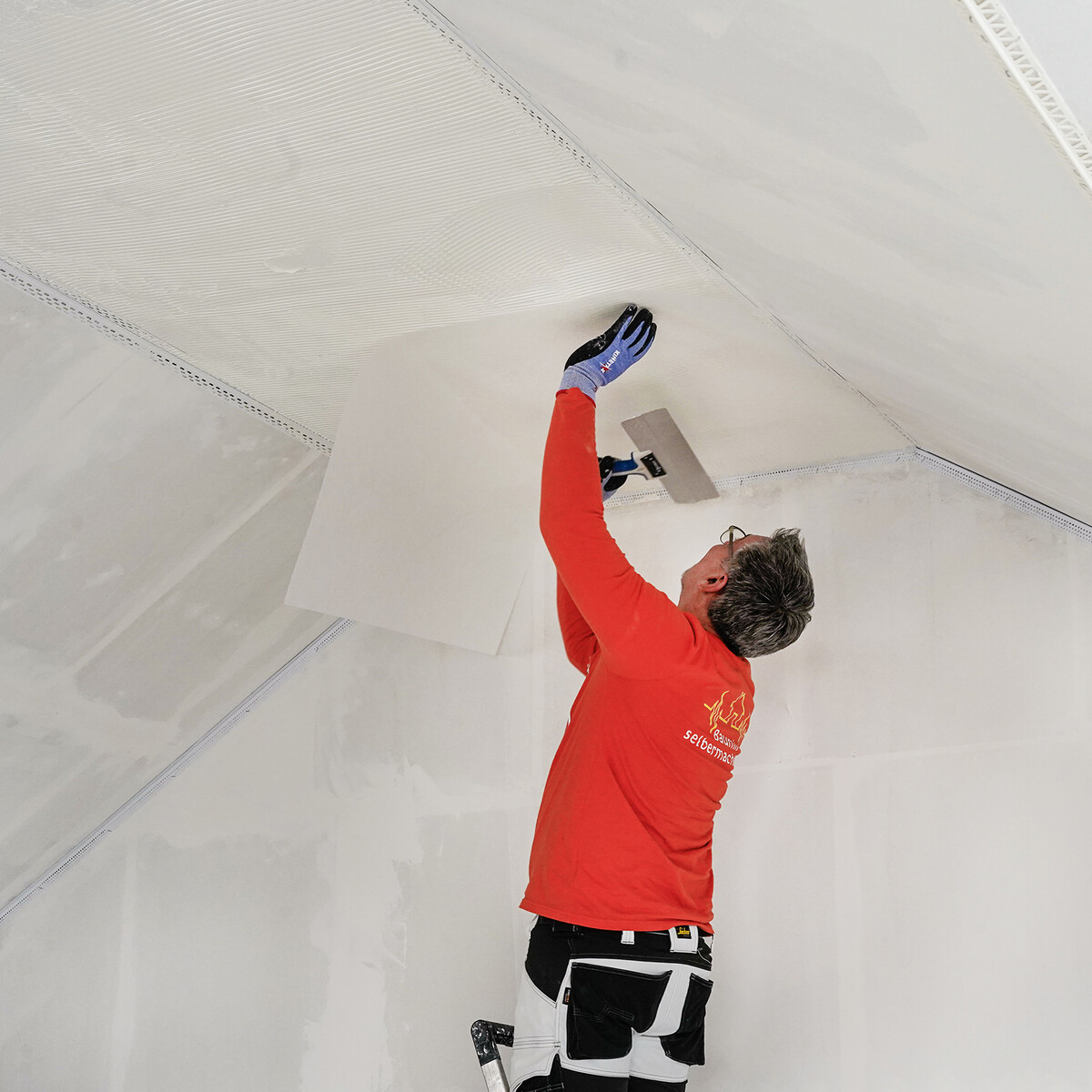 In dieser Anleitung zeigen wir dir, wie du eine Trockenbaudecke, -schräge oder -wand vollflächig mit Rollspachtel beschichtest. Um die Risssicherheit deutlich zu erhöhen, wird dabei ein Spachtelvlies in die frische Spachtelmasse eingebettet. Besonders wenn die Fläche abschließend gestrichen wird, ist die Einlage eines Spachtelvlies sehr empfehlenswert.