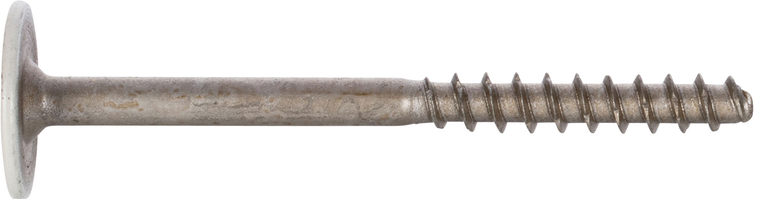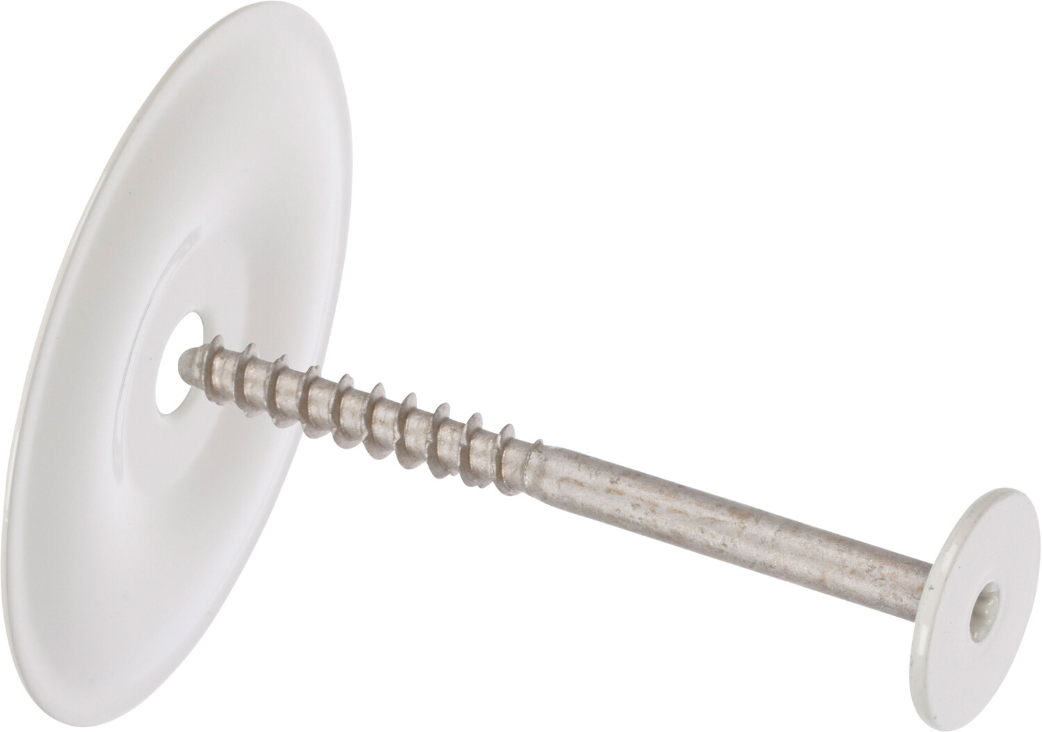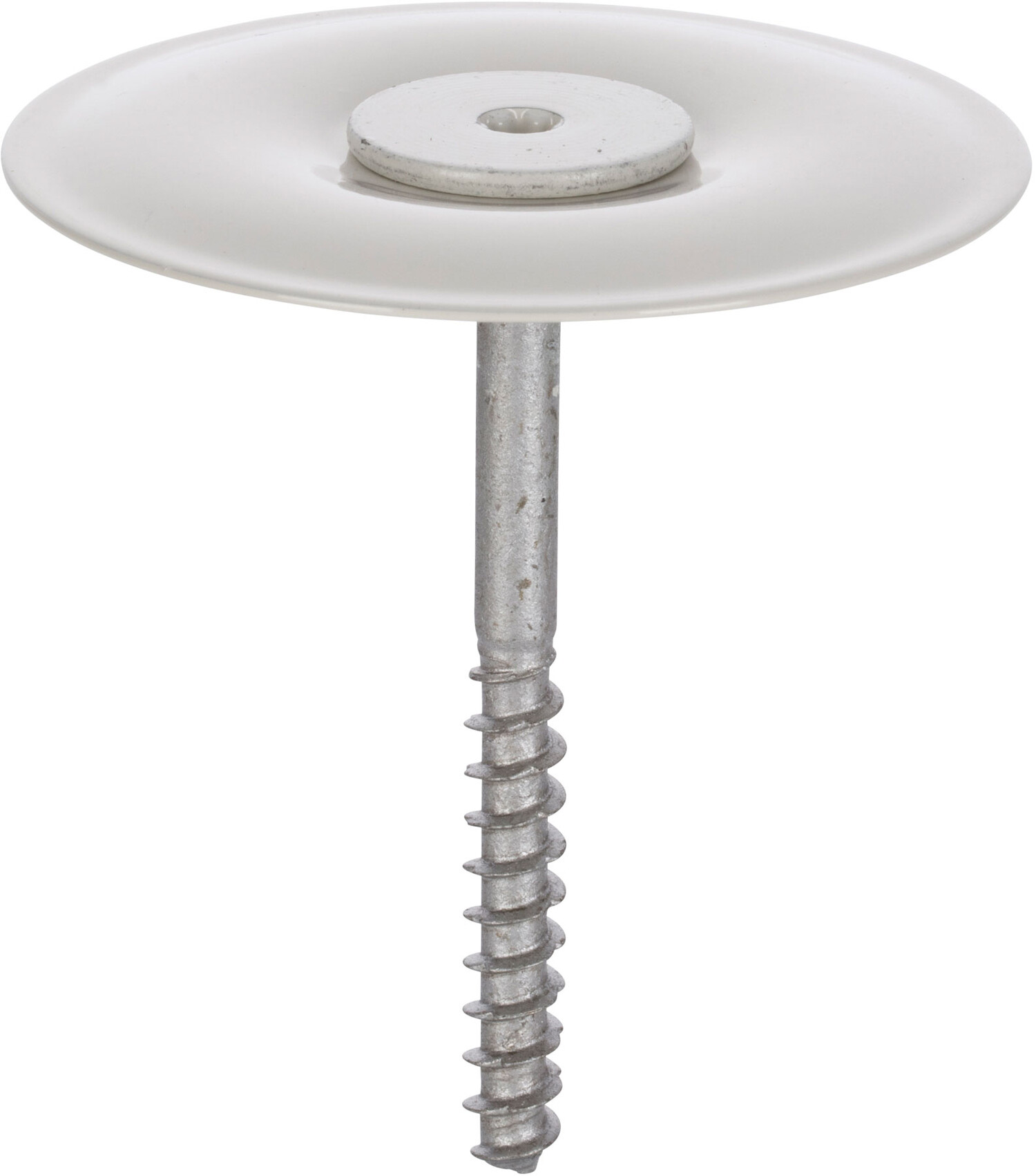Bauaufsichtlich zugelassene Deckendämmschraube aus Metall für Kellerdecken aus Beton. Nutzbar in Kombination mit Kellerdecken-Dämmteller für Kellerdeckendämmung aus Mineralwolle für die zusätzliche Verdübelung. Weiß lackiert