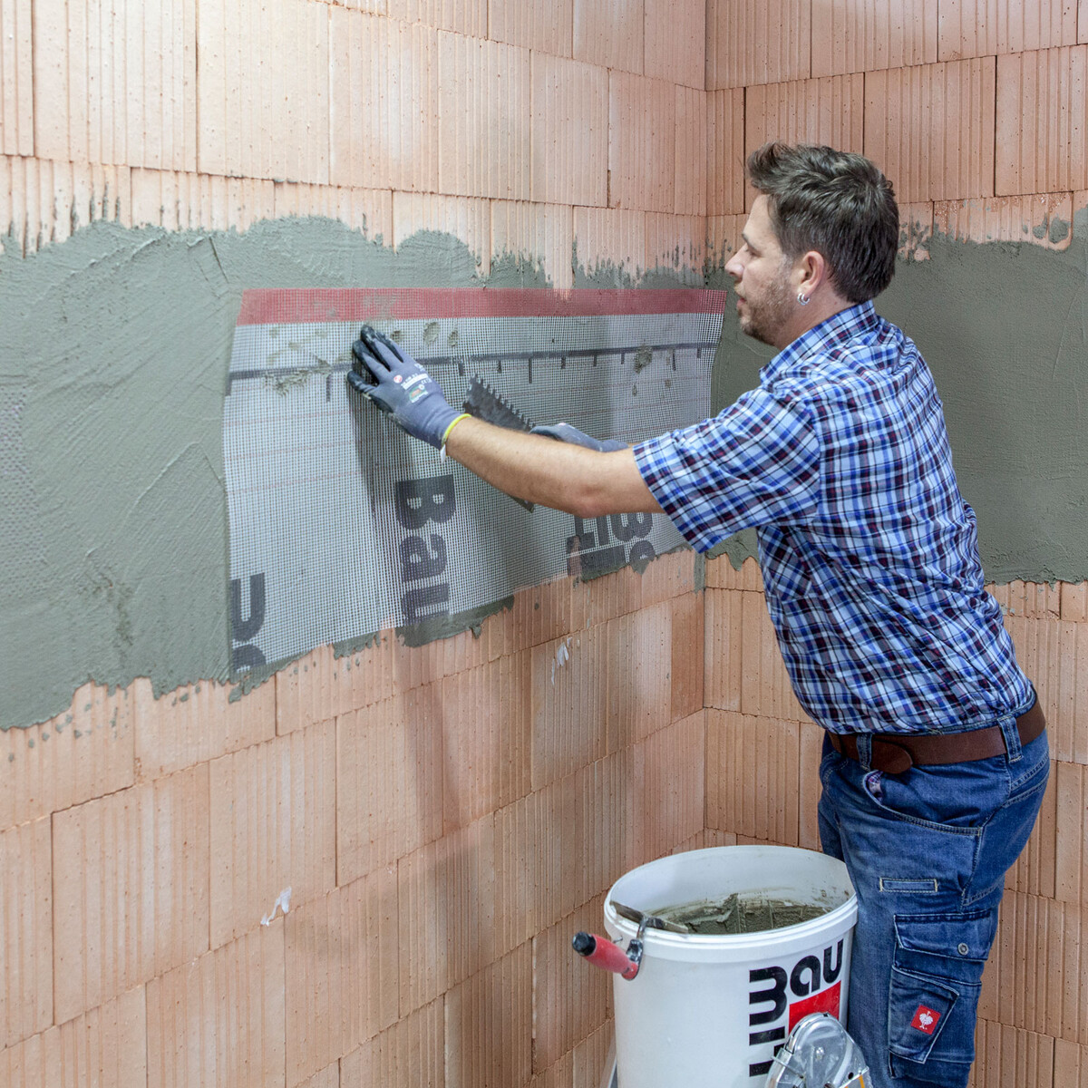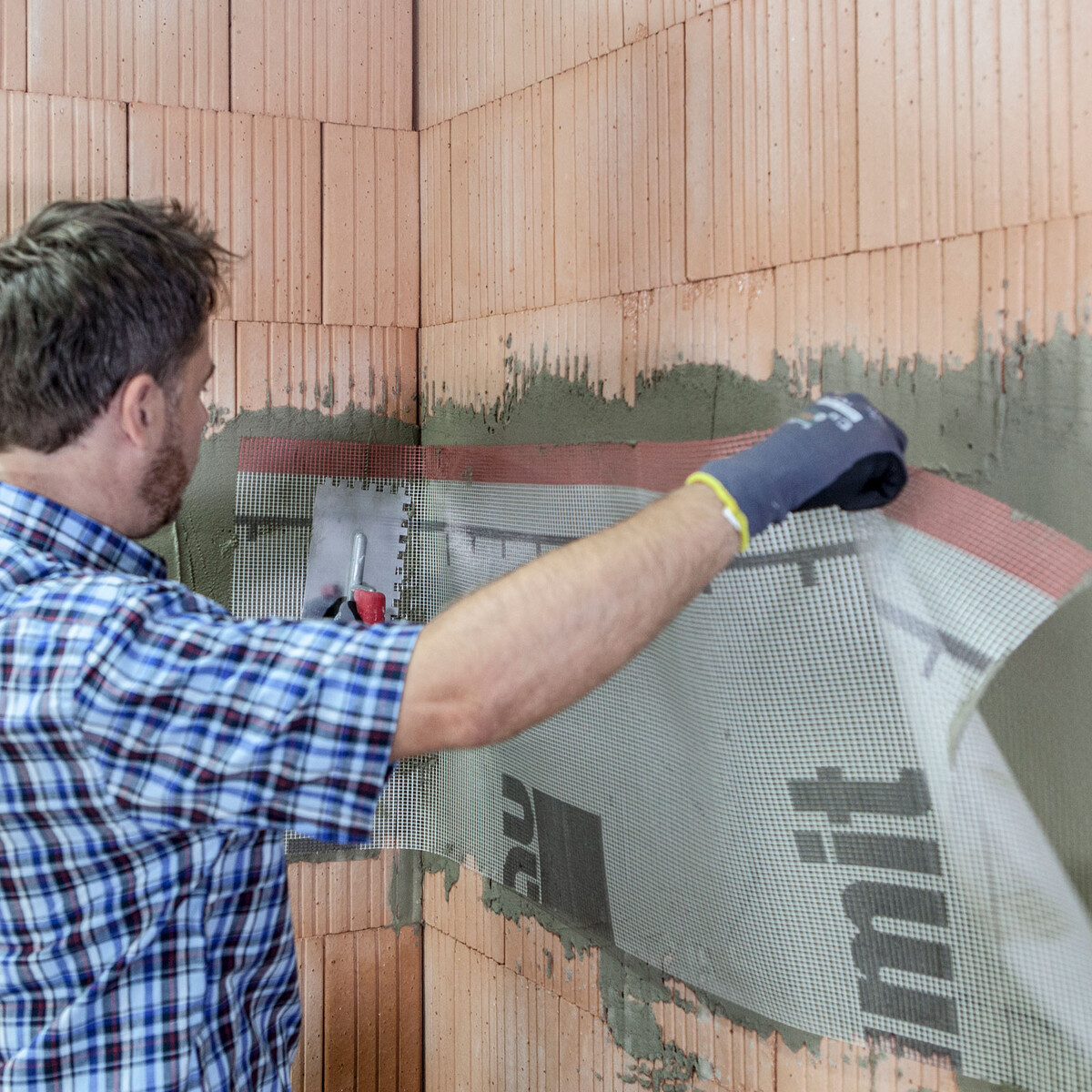 Bette das Gewebe vollflächig in die Spachtelung ein. Sollte das Material auf der Wand nicht ausreichend sein, trage weiteren Spachtel auf. Nach Abschluss der Arbeiten soll das Gewebe komplett in der Spachtelung liegen und nicht mehr zu sehen sein.