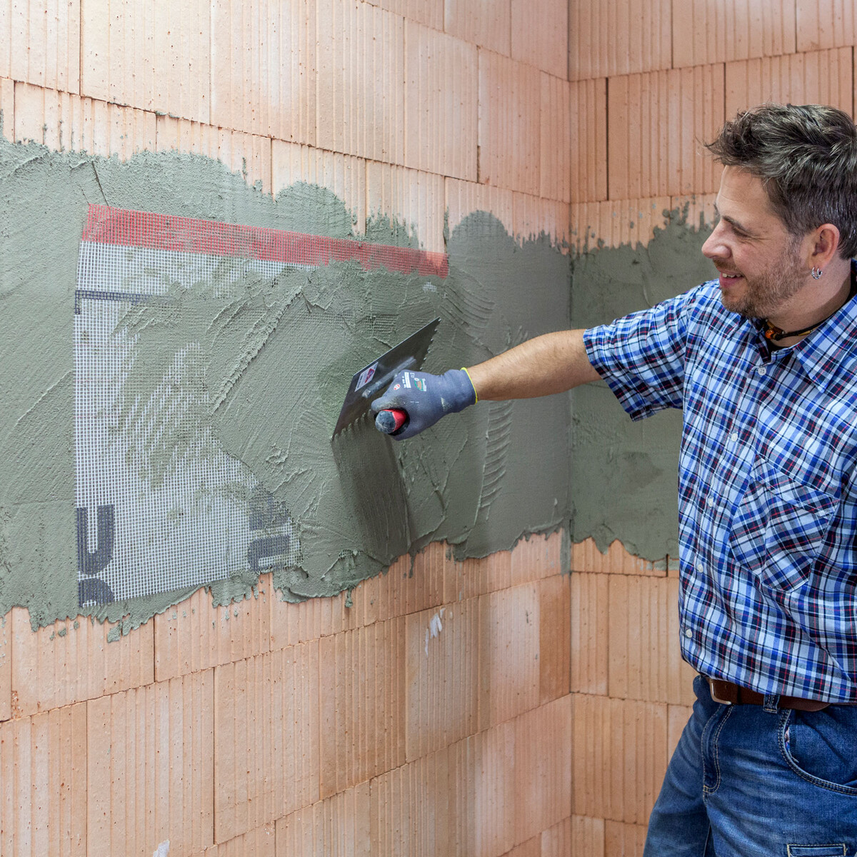 Klebespachtel ist ein Zementprodukt und damit alkalisch. Schütze dich mit entsprechender Arbeitskleidung (Arbeitshandschuhe, Schutzbrille, etc.). Achte auf deine eigene Sicherheit beim Arbeiten an der Fassade. Verwende geeignete Steighilfen wie Leitern oder Arbeitsgerüste.