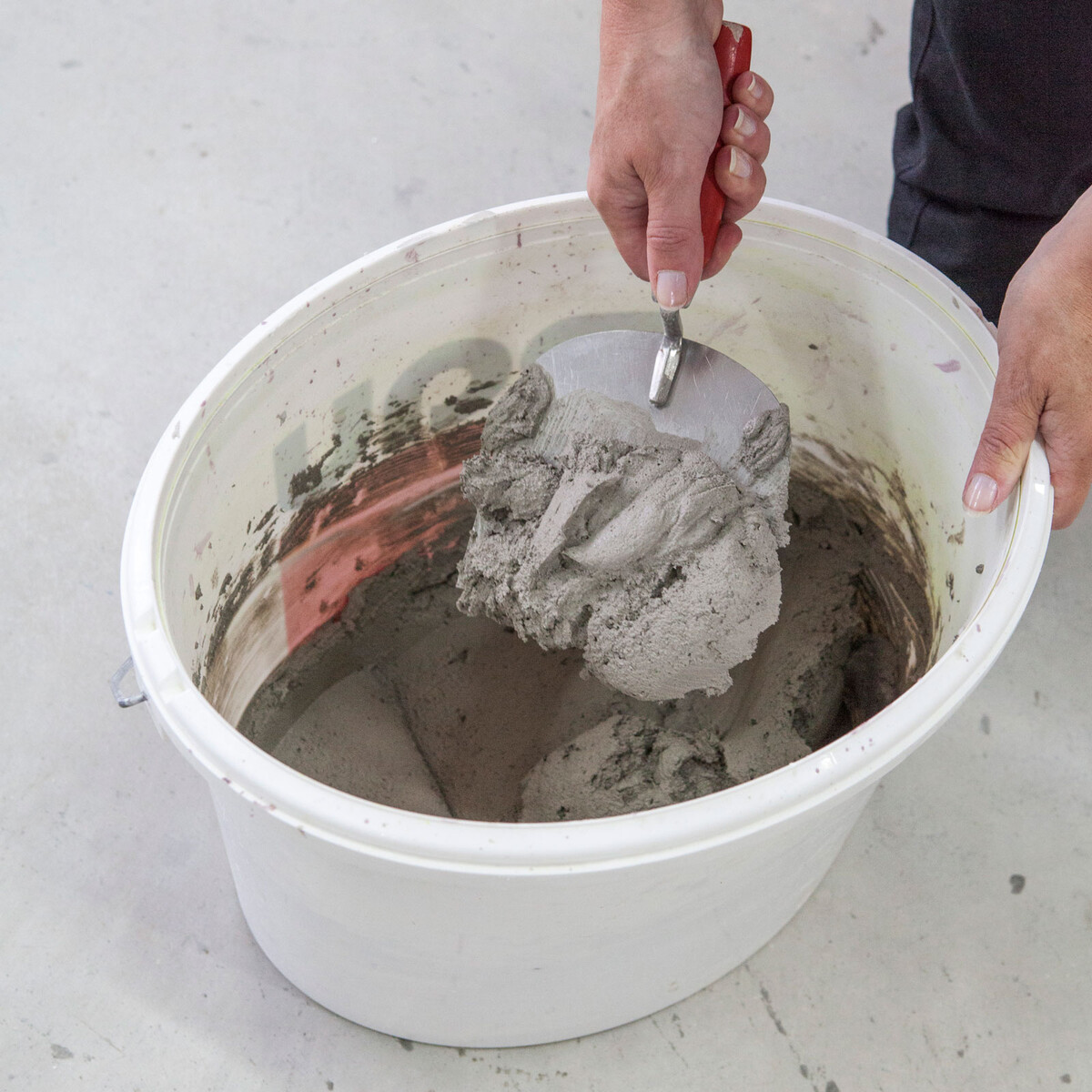 Anschließend rührst du die benötigte Menge Eckschienenmörtel Fix mit Wasser in einem sauberen Eimer an. Angaben zu den benötigten Wassermengen findest du auf der Rückseite des Sacks und im Produktdatenblatt. Rühre nur so viel Material an, welches du in