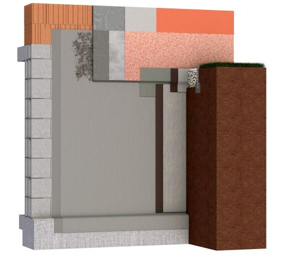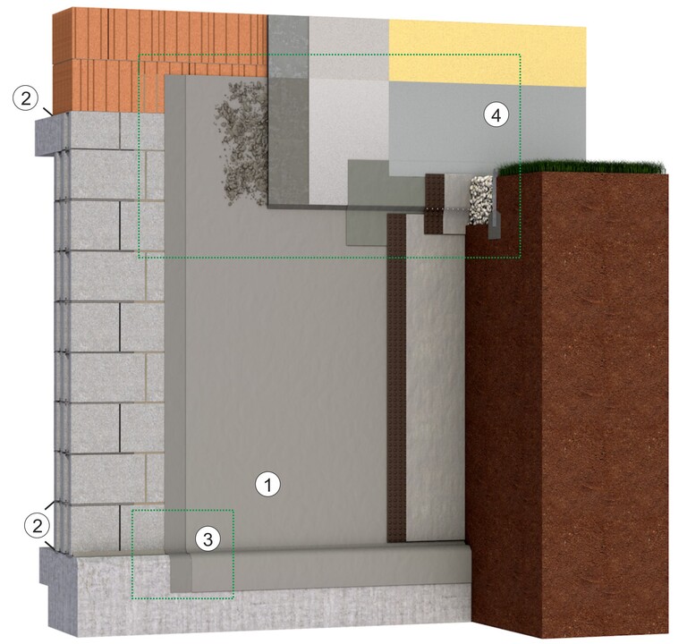 Die Vertikalabdichtung (1) arbeitet mit der Horizontalabdichtung (2) (auch Mauerwerkssperre genannt) als ein zusammenhängendes System. Beide Abdichtungen verhindern das Wasser seitlich über Kelle